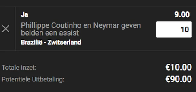 Op deze wedstrijd zijn heel wat interessante weddenschappen mogelijk. Beide teams scoren bijvoorbeeld, staat aan een mooie quotering van 2.15. Of Brazilië wint beide helften: 2.08. Voor degene die iets meer risico durven te nemen raden we volgende combinatiebet aan: 'Coutinho en Neymar geven elk een assist'. De twee uitblinkers toonden zich in de voorbereiding al in uitstekende doen en willen uiteraard bevestigen in Rusland. Aan deze weddenschap is een mooie quotering van 7.00 verbonden.