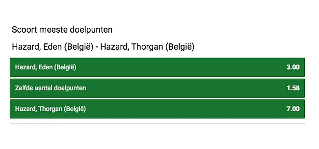 De IJslanders verloren afgelopen weekend echter met 6-0 van Zwitserland. De omstandigheden zijn dinsdag weliswaar anders, maar toch zijn de Belgen duidelijk favoriet met een quotering van 1.36 tegenover 9.00 maal je inzet als de IJslanders winnen. Om een grotere winst te boeken moet je dus hopen op de IJslanders óf een alternatieve bet op de Duivels zetten. Zo kan je de broertjes Hazard tegen mekaar uitspelen. Denk je dat Eden het meeste zal scoren, dan levert je dat 3.00 maal je inzet op. Of zie je Thorgan het halen van zijn grotere broer? Dan kan je 7.00 maal je inzet pakken.