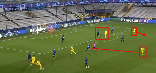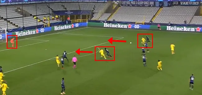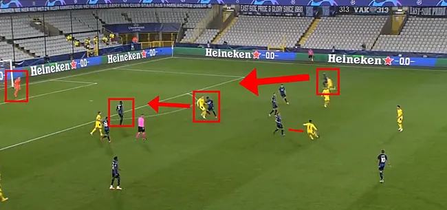 Het beslissende moment. Vormer zit ondertussen dichter bij Dahoud, maar zet geen echte druk. Door de beweging zonder bal van Hazard ligt er een boulevard open achter Sobol, die op gelijke hoogte staat met Meunier en Diatta. Hoewel zij hier nog nek-aan-nek lijken te zitten, heeft Meunier door een van zijn typische loopacties langs binnen dan al de bovenhand – een fractie later geniet hij een bonus van meters. De ruimte wordt overigens nog groter door het feit dat Mignolet, die nochtans vaak ver uit zijn doel staat, bijna op zijn lijn vertoeft. Vlak voor de pass naar de buitenkant vertrekt, draait Haaland zich in het midden reeds doelbewust om voor een spurt richting het penaltypunt. Misschien kon Kossounou hem nog de pas afsnijden, al moest hij door de manier waarop de fase tot stand kwam tevens rekening houden met de ruimte in zijn eigen zone. Bovendien mist de Ivoriaan hier allicht net de nodige ervaring.