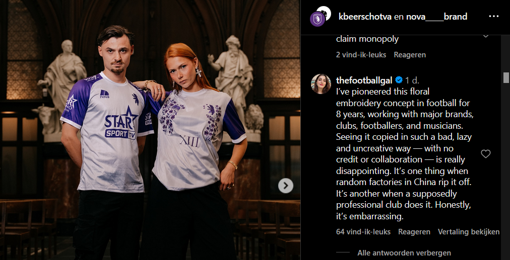 De ontwerpster kon haar ogen niet geloven dat een professionele voetbalclub een concept zo zou stelen. “Het is één ding wanneer willekeurige fabrieken in China het beroven. Het is iets anders als een zogenaamde professionele club het doet. Eerlijk waar gênant”, citeerde Het Nieuwsblad Al Shammari. Er volgen mogelijk ook gerechtelijke stappen.